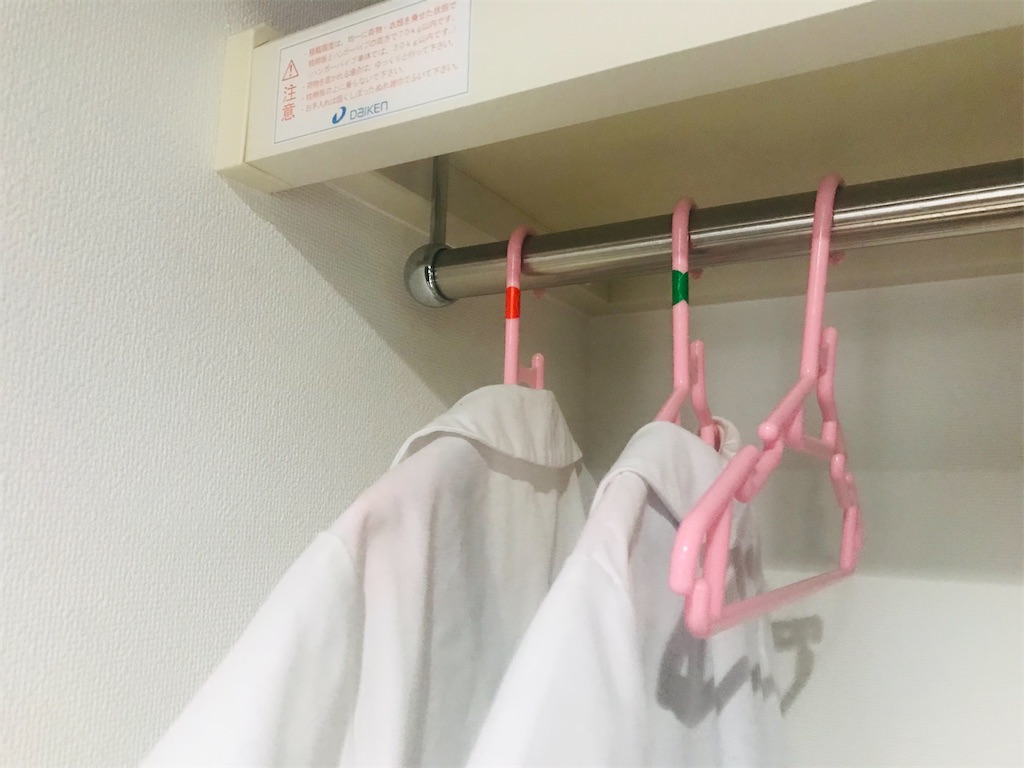 制服のハンガーにはそれぞれ色シールを貼っておき、干す時から区別しておく。